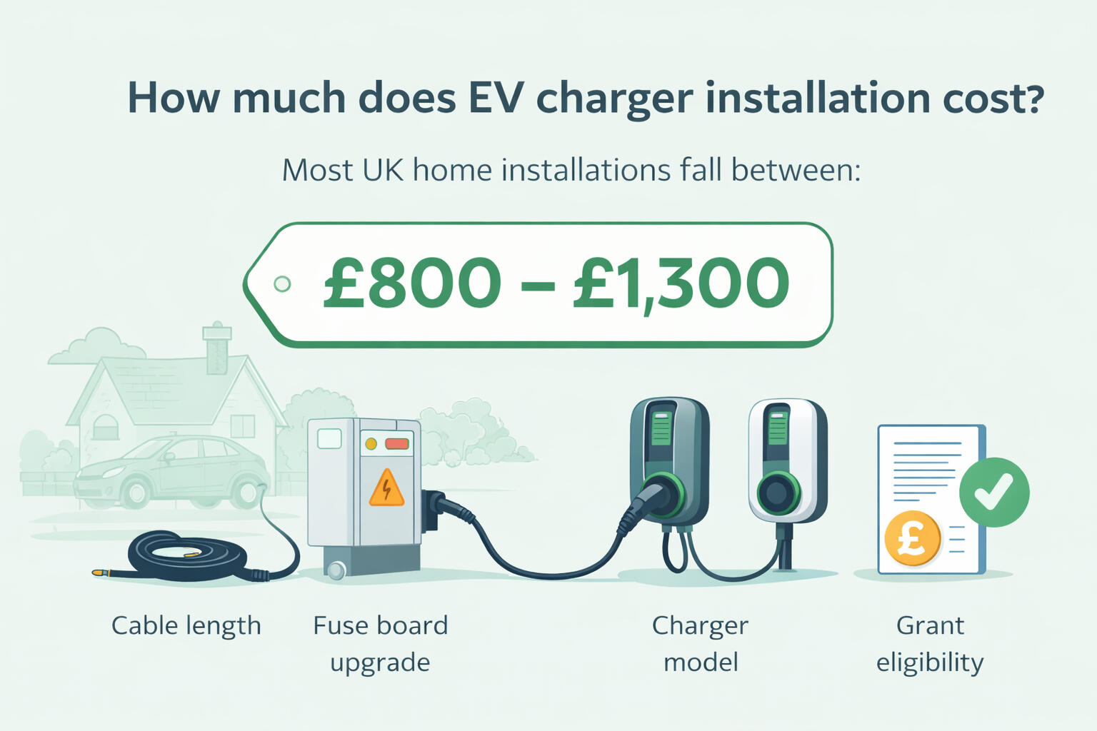 Most UK home installations typically fall between £800–£1,300, depending on your property, charger choice, and electrical setup.